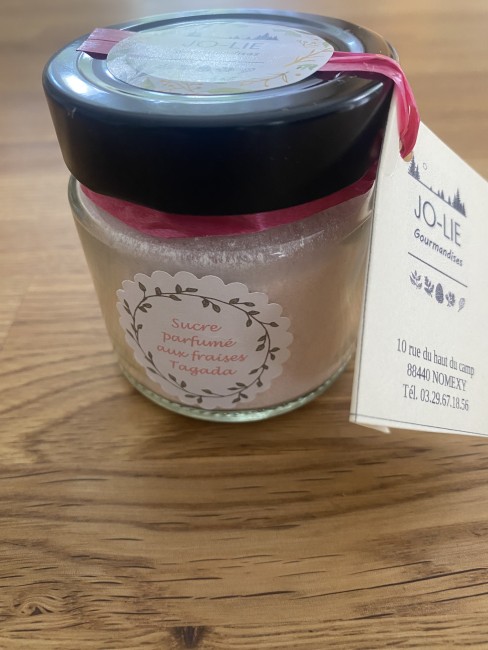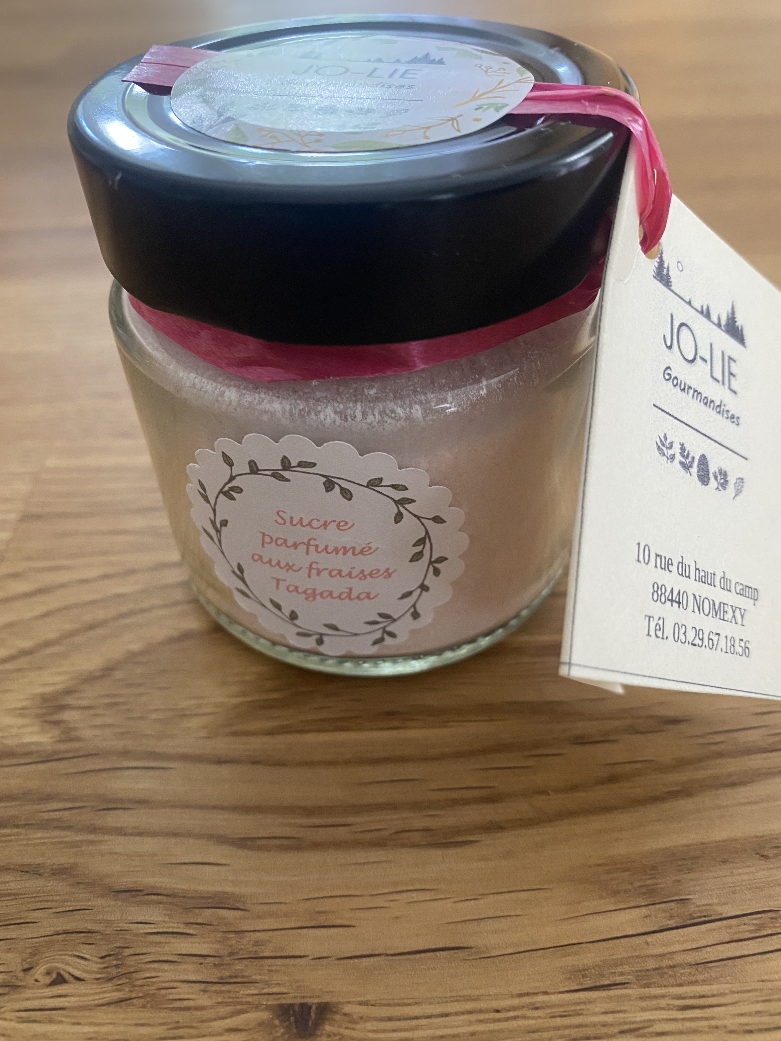 - aux fraises Tagada - A saupoudrer sur vos desserts : yaourt, fromage blanc, fraises Melba, etc... ou pour donner un léger parfum à votre pâte à brioche.